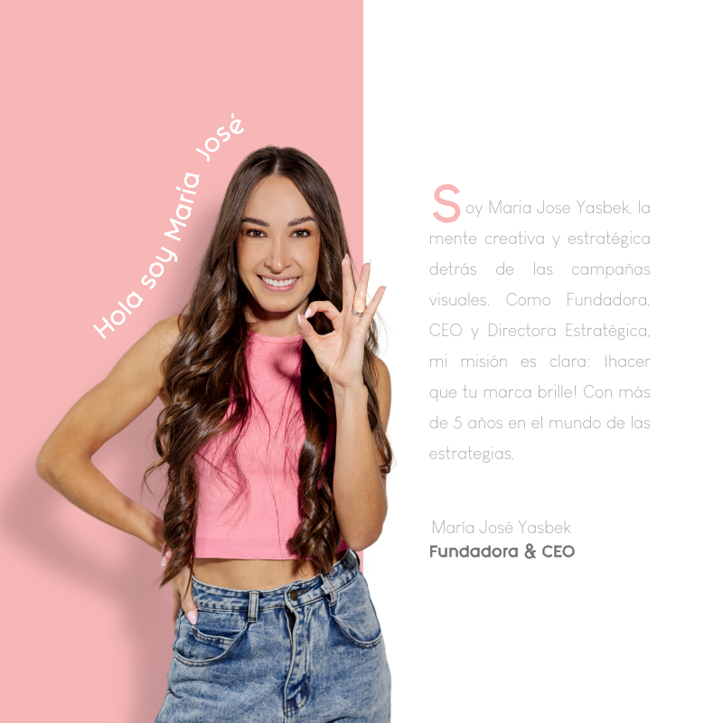 Soy Maria Jose Yasbek, la mente creativa y estratégica detrás de las campañas visuales. Como Fundadora, CEO y Directora Estratégica, mi misión es clara: ¡hacer que tu marca brille! Con más de 5 años en el mundo de las estrategias, ¡Soy una economista con un toque de genialidad creativa! Me encanta construir sueños, asesorar, crear y estar en constante evolución cada día. Emprendedora apasionada, creativa, planificadora amante del marketing y los números. ¡Siempre verás el tablero de cada cliente en perfecto orden! Me encanta planificar y posicionar marcas con éxito. Estoy aquí para guiar tu marca hacia el éxito visual.